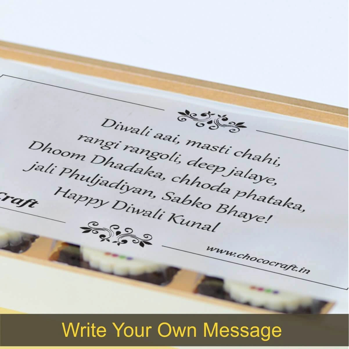 We offer printed chocolates, personalized messages, and packaging in MDF wooden boxes. We also personalize gifts for festivals and individuals with names/photos.