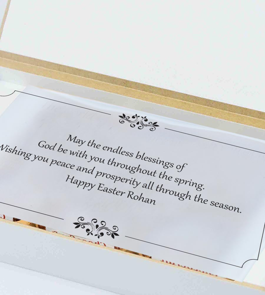 We offer printed chocolates, personalized messages, and packaging in MDF wooden boxes. We also personalize gifts for festivals and individuals with names/photos.