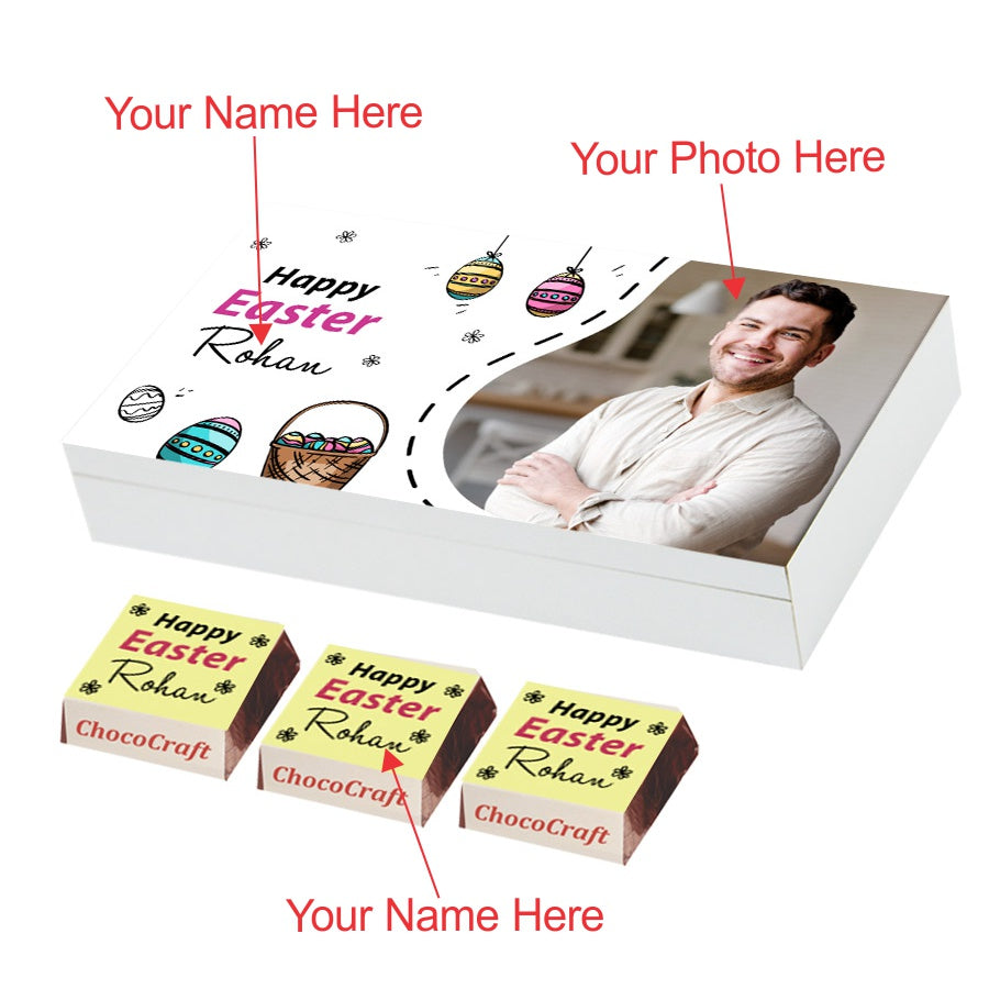 Name & Photo Upload the photo for the box. Provide the name for printing on the box and chocolate wrapper.