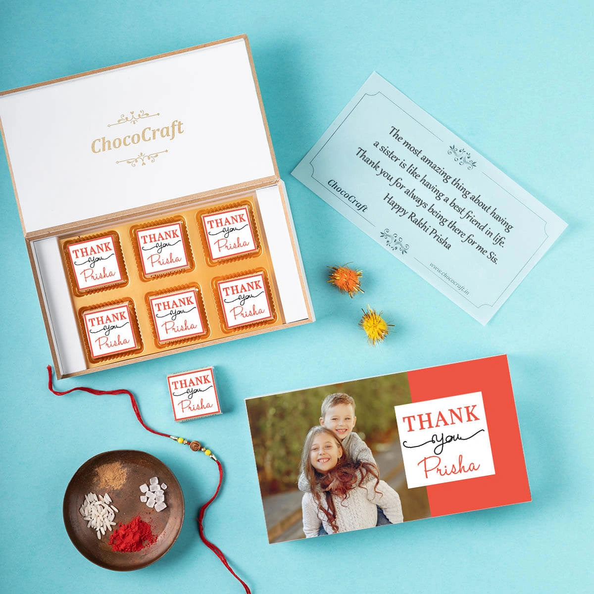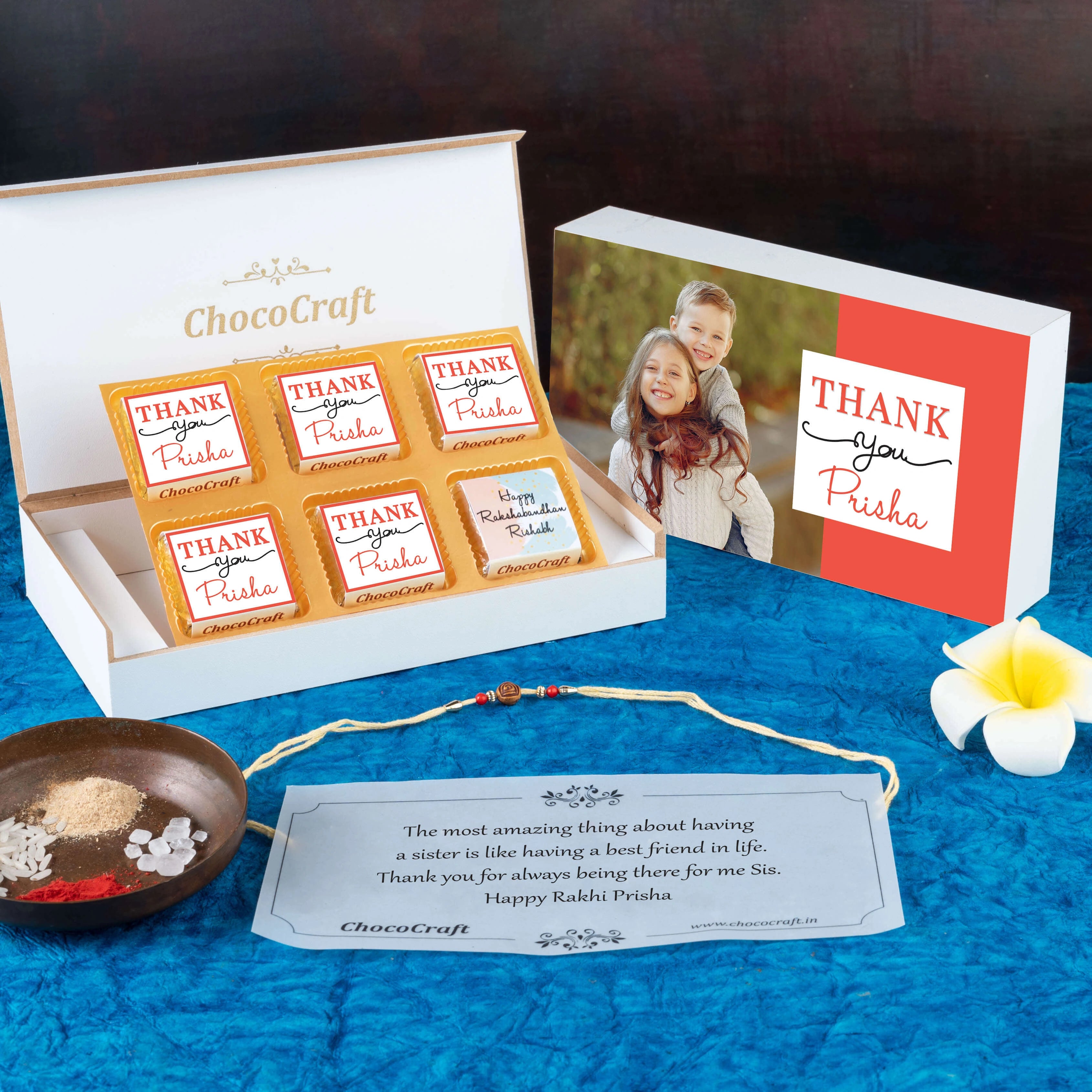 Turn your favourite snapshot into an edible keepsake! This “Innocent Memories” hamper delivers a customised rakhi with photo experience wrapped inside a box of silky chocolates—each square printed with her name, your picture and a heartfelt note. The result? One of the most meaningful customised gifts for rakhi you can send. Choose a handcrafted MDF box of 6, 12 or 18 pieces, add an optional twin-rakhi pack with roli-chawal, and enjoy free India-wide delivery within 3-7 working days.