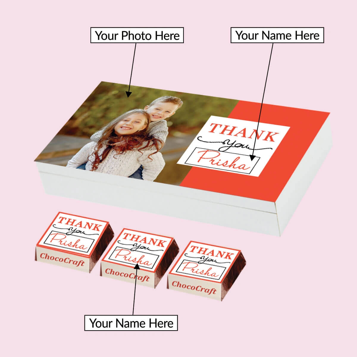 Name & Photo Upload the photo for the box. Provide the name for printing on the box and chocolate wrapper.