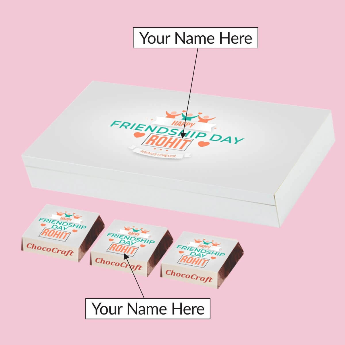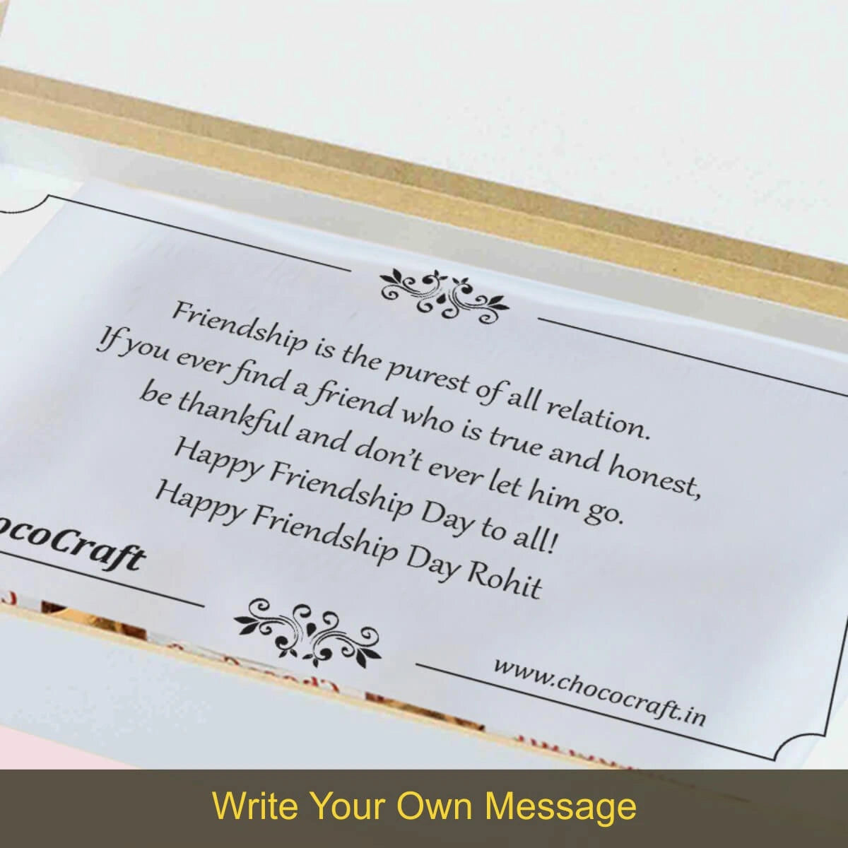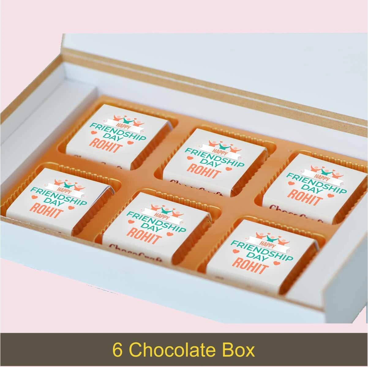 We offer printed chocolates, personalized messages, and packaging in MDF wooden boxes. We also personalize gifts for festivals and individuals with names/photos.