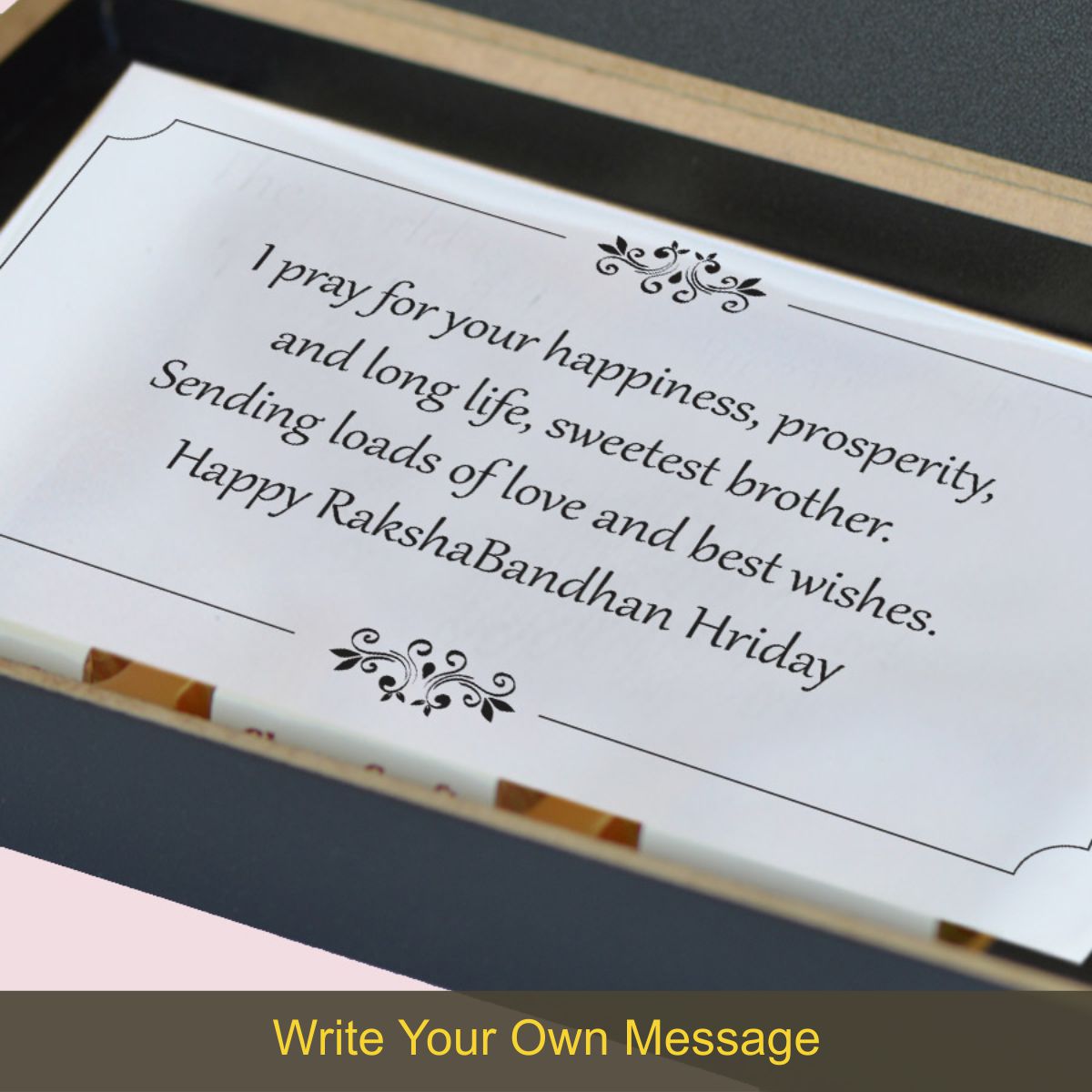 • Message on Butter Paper: You can also give us a message to be printed and placed inside the box. Please note that it is not possible to print emojis and other symbols. Use plain text only.