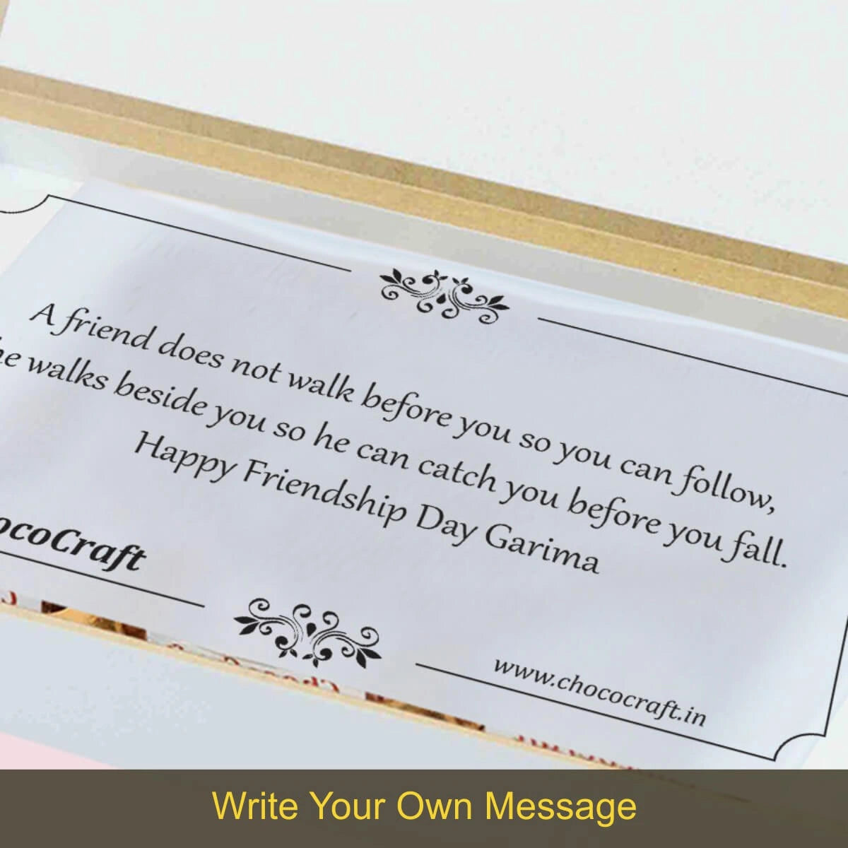 We offer printed chocolates, personalized messages, and packaging in MDF wooden boxes. We also personalize gifts for festivals and individuals with names/photos.