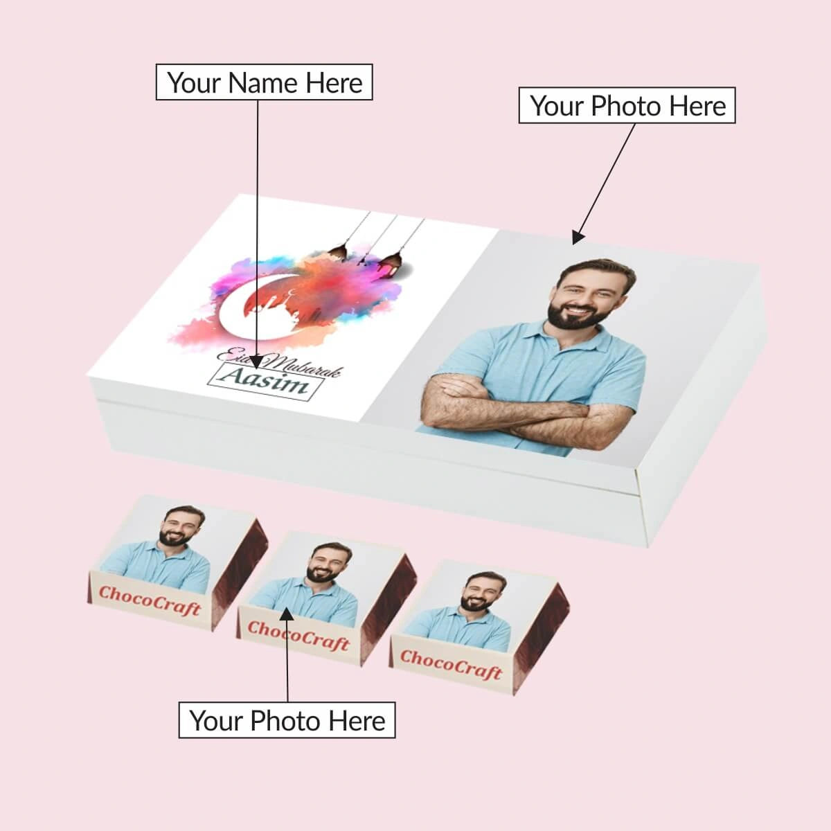 Name & Photo Upload the photo for the box and chocolate wrapper. Provide the name for printing on the box.