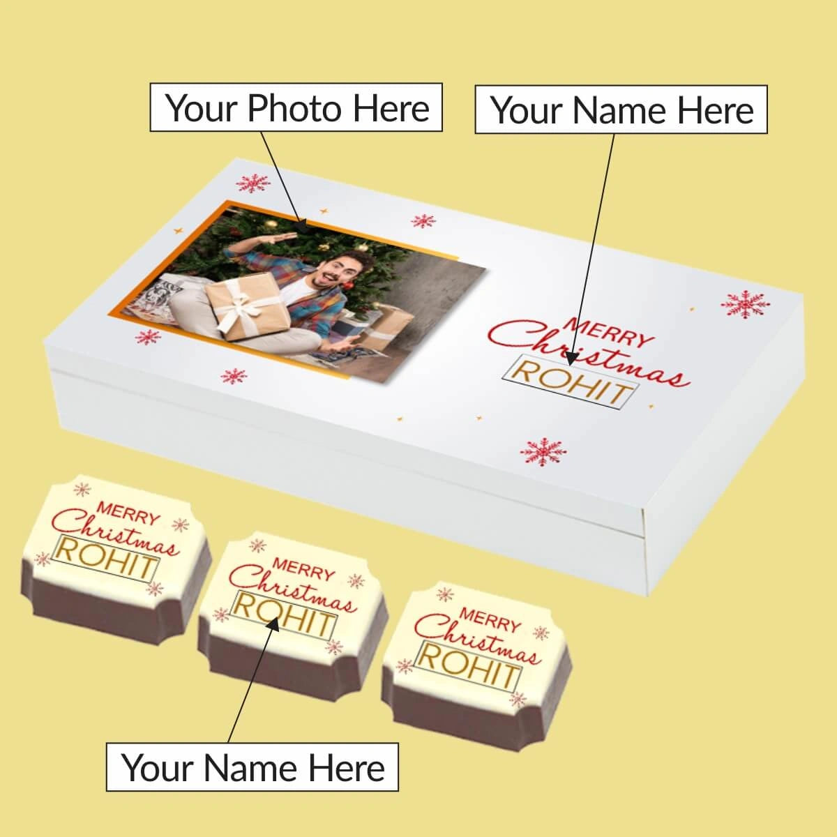 Name & Photo Upload the photo for the box. Provide the name for printing on the box and chocolates.
