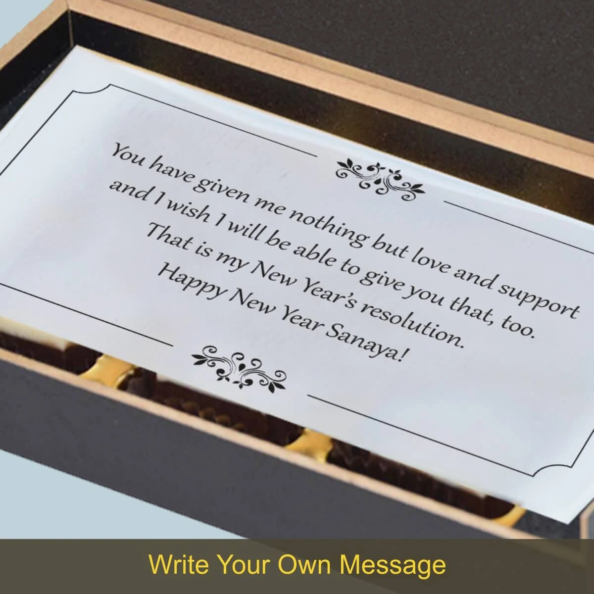 We offer printed chocolates, personalized messages, and packaging in MDF wooden boxes. We also personalize gifts for festivals and individuals with names/photos.