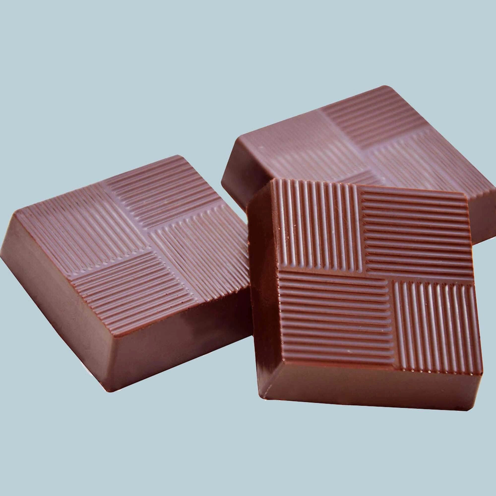 Premium dark, milk, and white chocolates from Cargill Foods, Singapore. Printed chocolates are layered with white chocolate on top.
