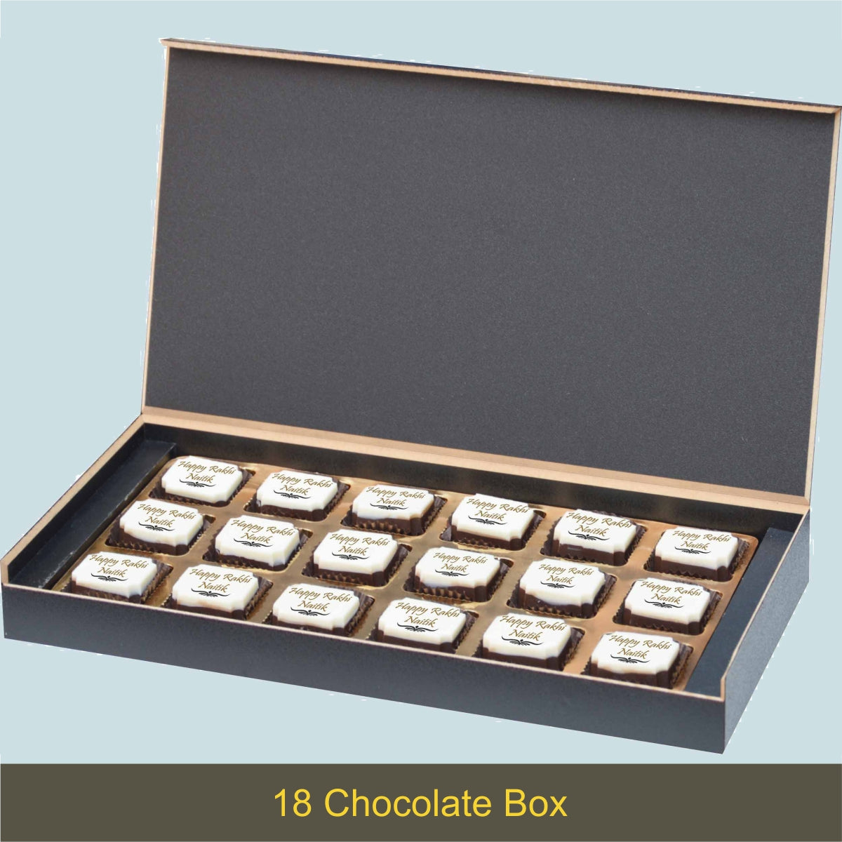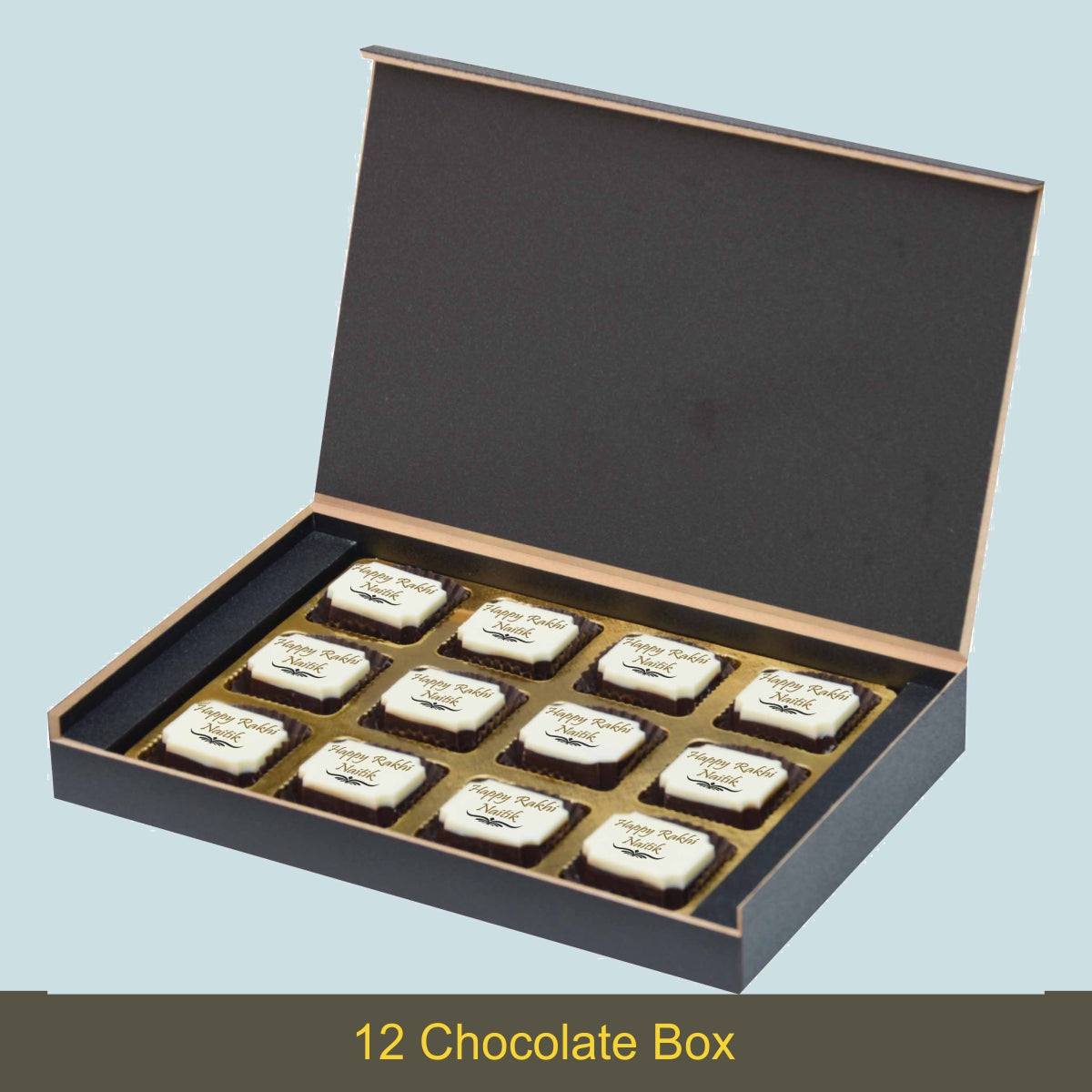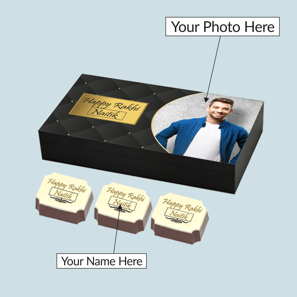 Looking for a unique rakhi for brother that doubles as one of the most memorable unique rakhi gifts for brother? This printed-chocolate hamper turns silky squares into keepsakes—each piece carrying his name, your favourite photo, and a heartfelt note. Choose a handcrafted MDF box of 6, 12, or 18 chocolates, add an optional twin-rakhi pack with roli-chawal, and we’ll deliver your personalised surprise anywhere in India within 3-7 working days—shipping on us.
